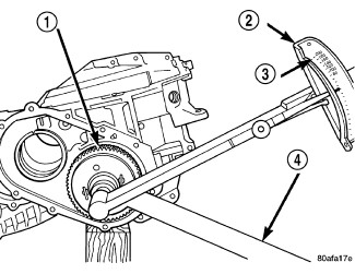 c. Using a Dial Indicator (2) (Figure 17) mounted to the transaxle case, measure output gear (4) end play.