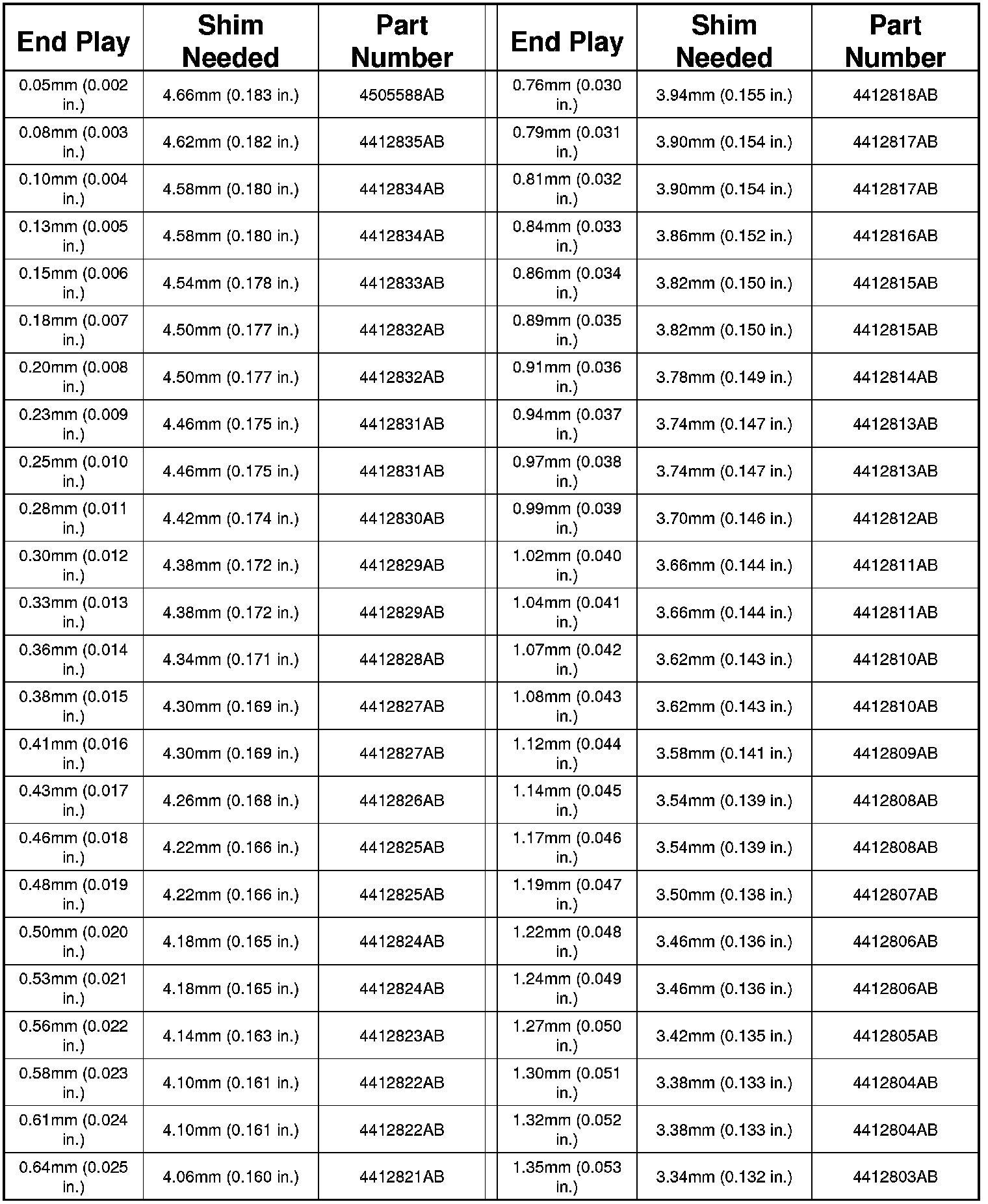 TRANSFER SHAFT BEARING SHIM CHART