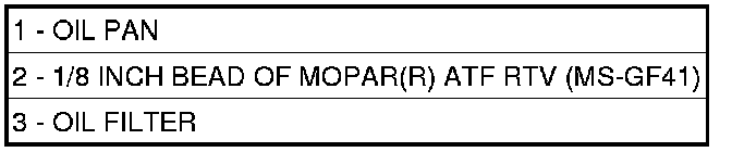 78. Apply a 1/8" bead of Mopar(R) ATF RTV (MS-GF41) (2)(Figure 72) to oil pan (1) and immediately install to case.