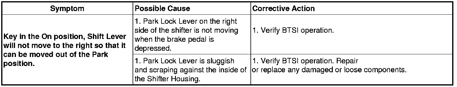 The Shift Interlock Cable is attached to a lever within the Shifter that prevents the Shift Lever from moving out of "Park" without the key. The Shift Interlock Cable adjustment is preset at the factory. When properly adjusted, the Shift Interlock System prevents the key being removed from the Key Cylinder when the Shift Lever is in a position other than "Park". The Brake Transmission Shift Interlock (BTSI) system prevents the shifter from being moved unless the brake pedal is applied.