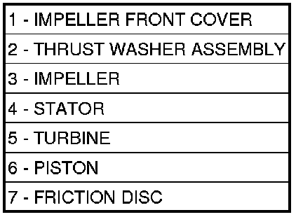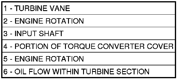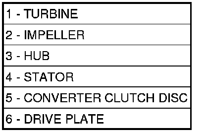 The torque converter is a hydraulic device that couples the engine crankshaft to the transmission. The torque converter consists of an outer shell with an internal turbine (1)(Figure 1), a stator (4), an over-running clutch, an impeller (2) and an electronically applied converter clutch (5). The converter clutch provides reduced engine speed and greater fuel economy when engaged. Clutch engagement also provides reduced transmission fluid temperatures. The converter clutch engages in third gear. The torque converter hub (3) drives the transmission oil (fluid) pump.