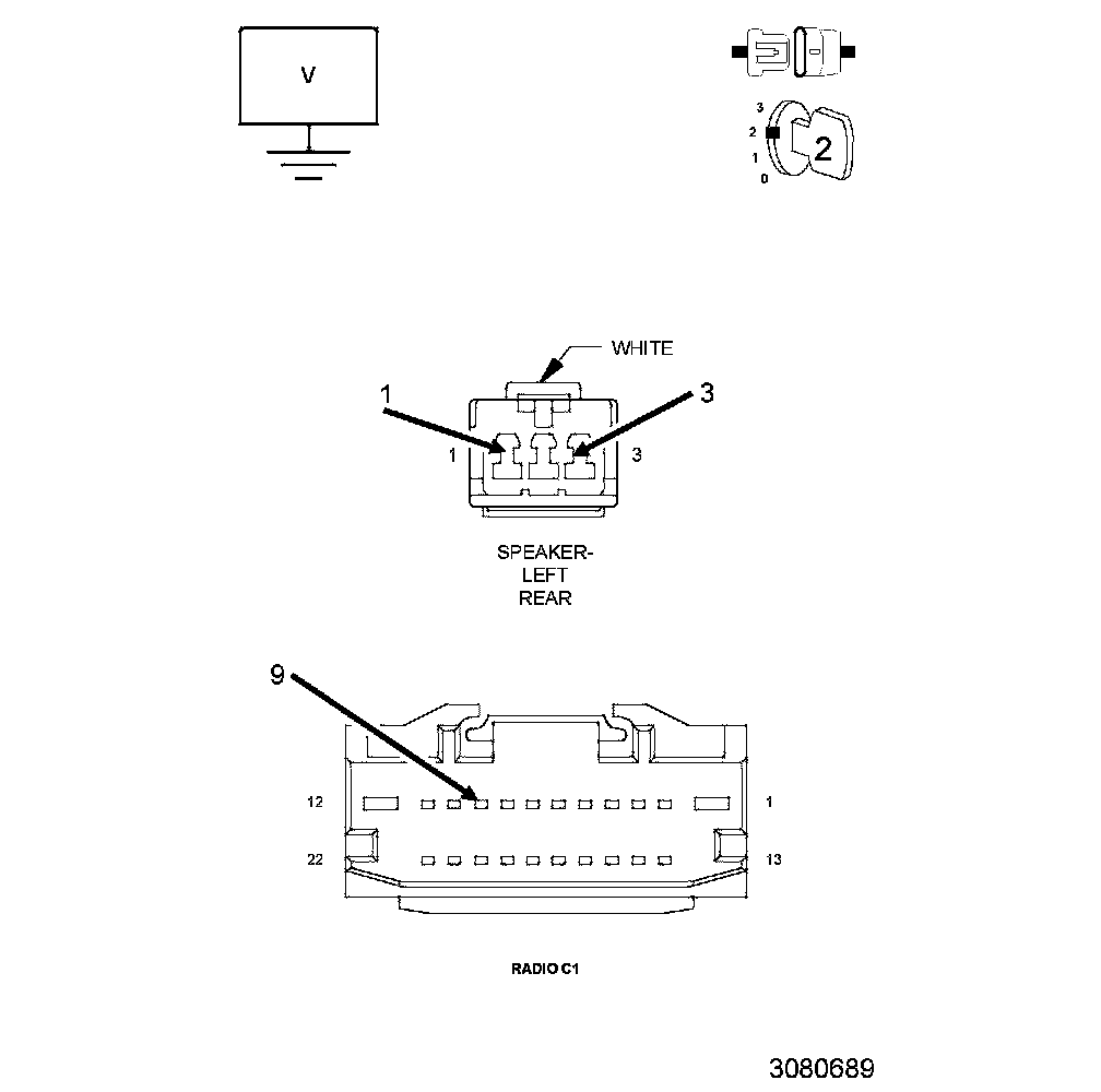 5. Measure the voltage between ground and the (X303) Left Rear Speaker (+) circuit.