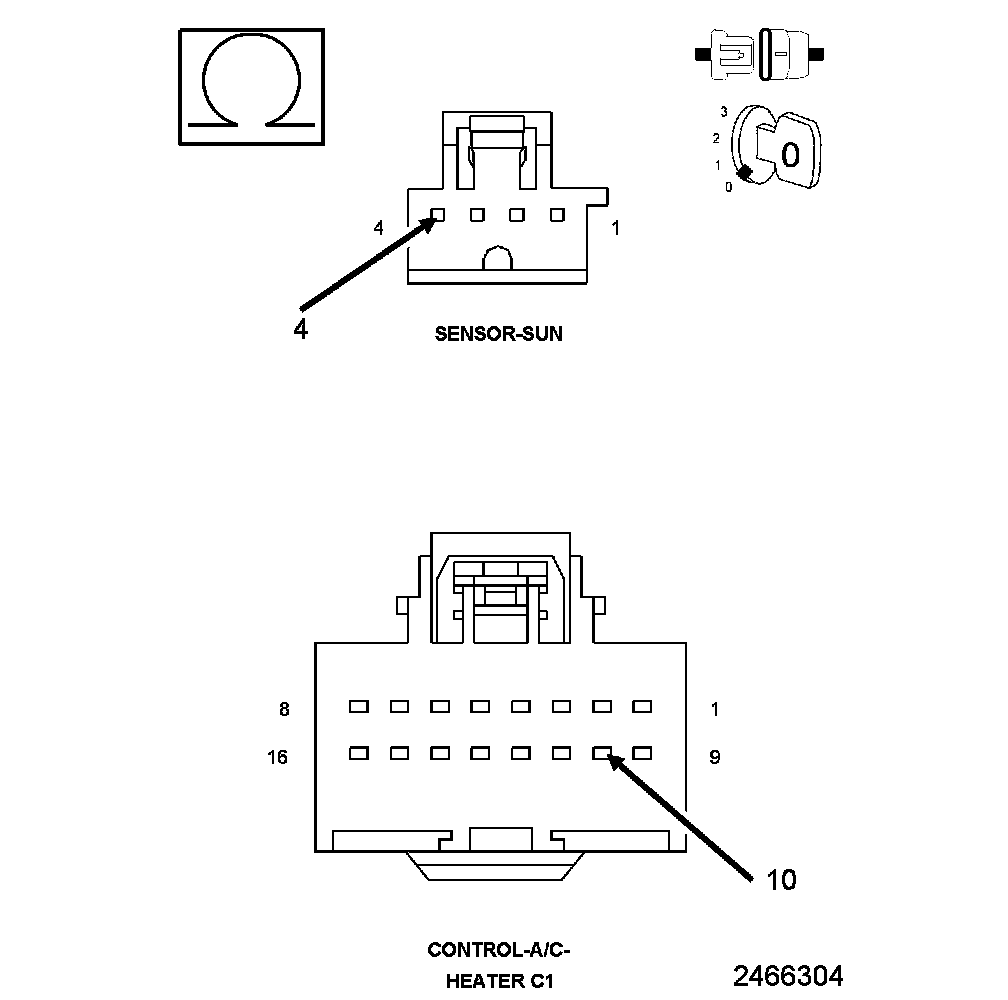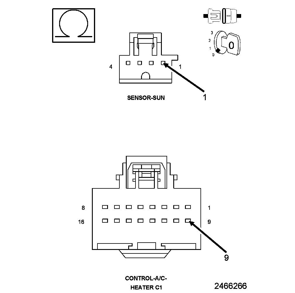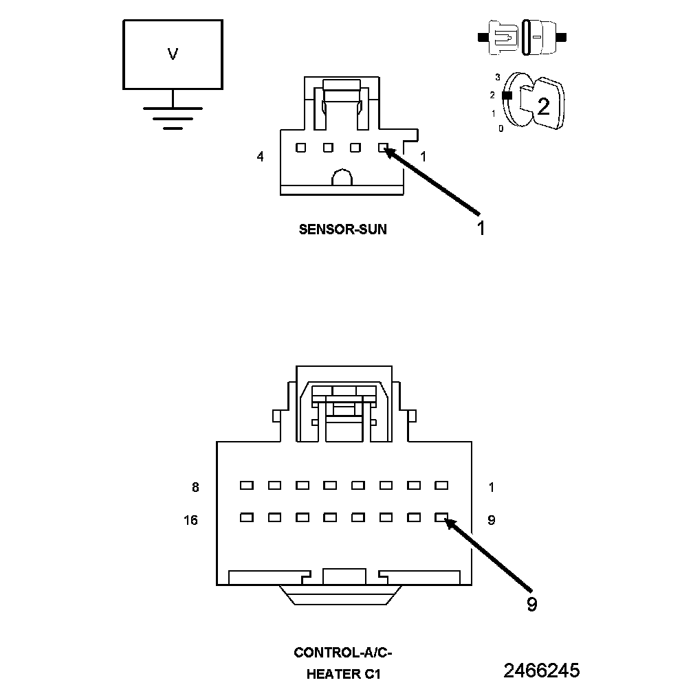 1. Measure the resistance of the (G939) Sun Sensor Return circuit between the A/C Heater Control C1 harness connector and the Sun Sensor harness connector.
