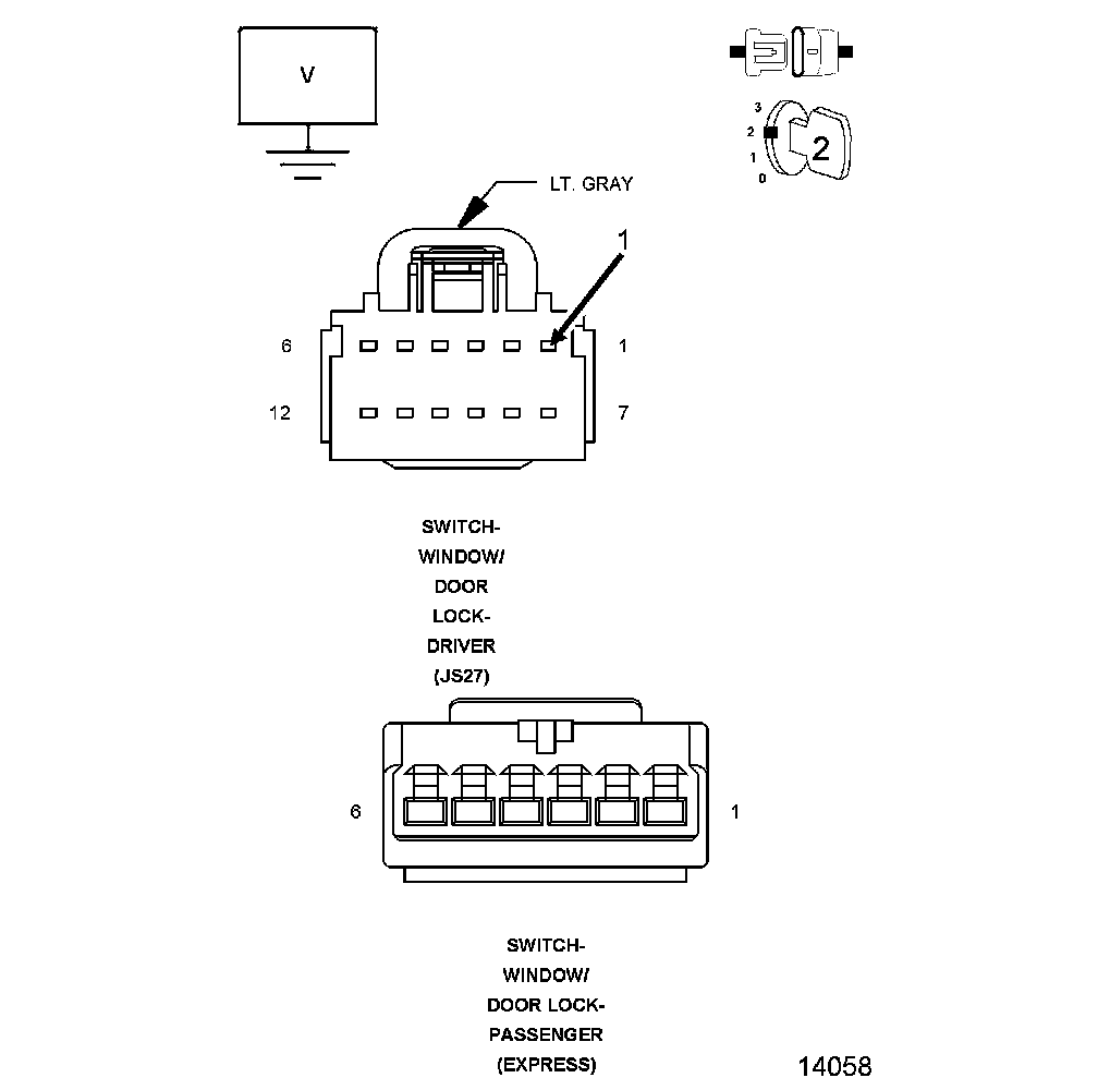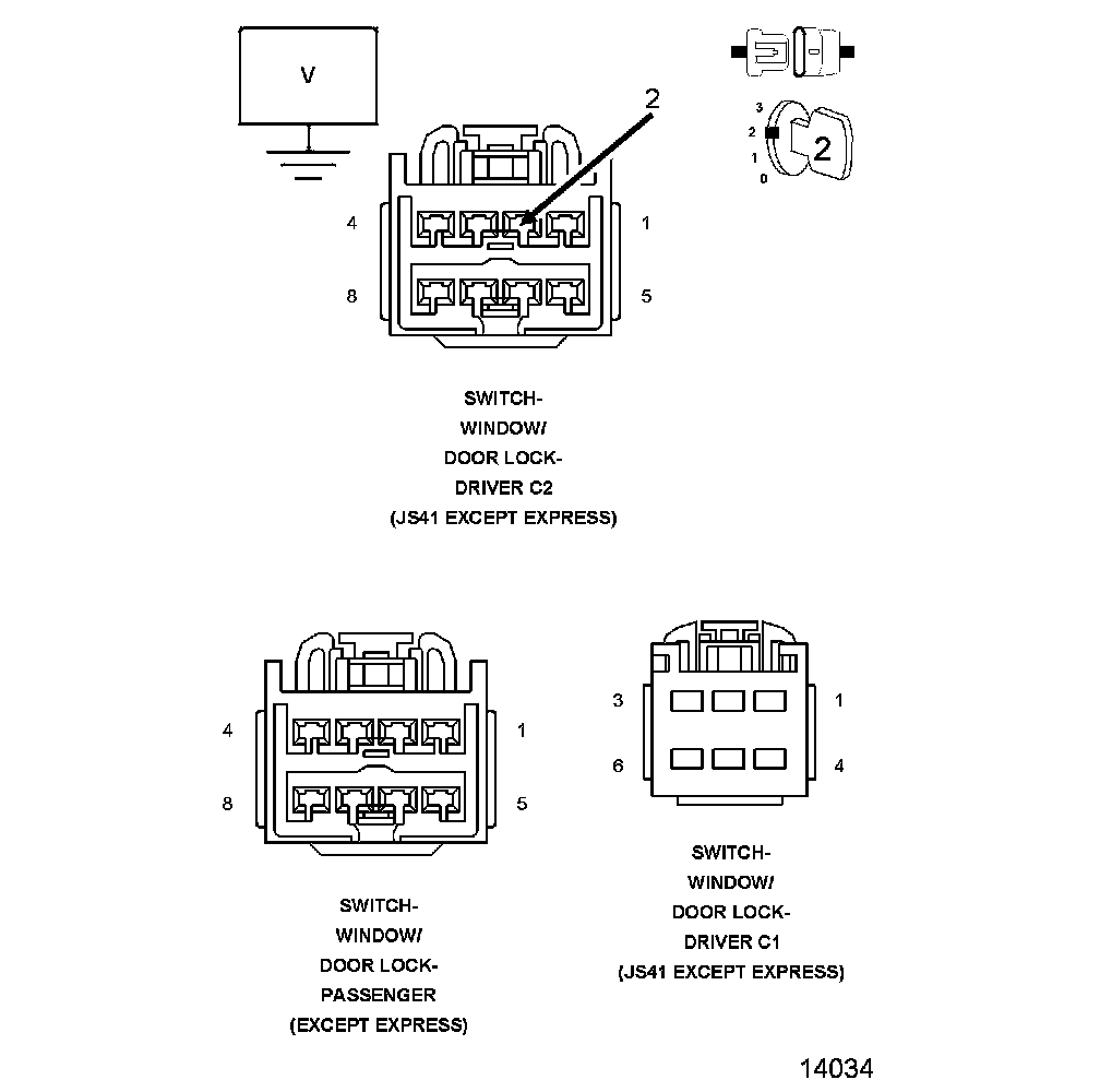 NOTE: The graphic shows the Driver Door Module connector. The Passenger Door Module uses the same cavities for the Window Express Driver circuits.
