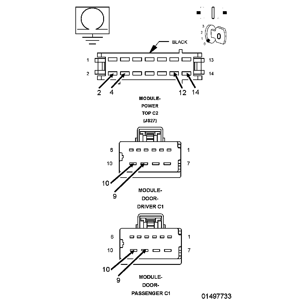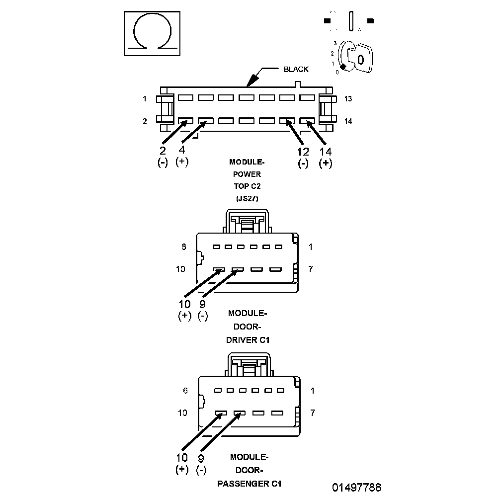 1. It will now be necessary to disconnect each front Door Module and the Power Top Control Module (C2) connector and check each Window Driver (Up and Down) circuit for a short to ground.