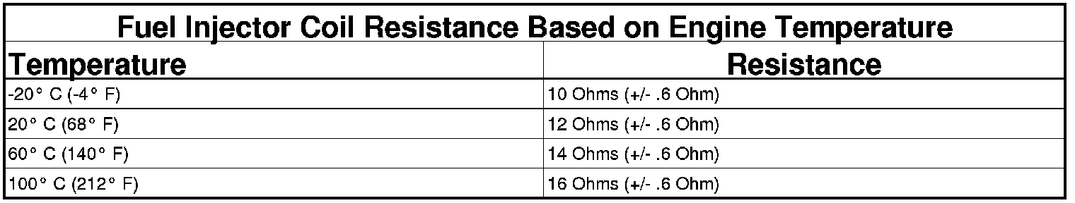NOTE: The resistance of the circuit will vary according to the temperature of the injector coil. Use the table below to determine the resistance range of the injector.