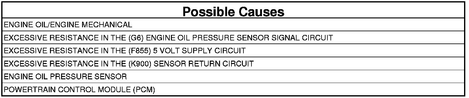 - Verify that there is good pin to terminal contact in the Sensor and Powertrain Control Module connectors. Remove the Engine Oil Pressure sensor and ensure the oil passage/port is free from any blockage. If OK, replace the Engine Oil Pressure Sensor.