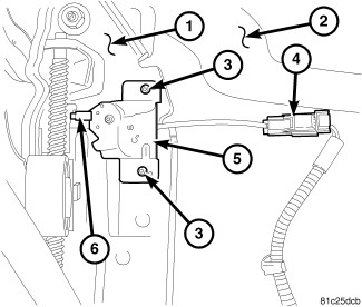 1. Position the tonneau extended limit switch (5) onto the four bar linkage (1). Ensure the switch sensing tab (6) is located properly so that the screw drive assembly makes contact with the tonneau cover fully extended.