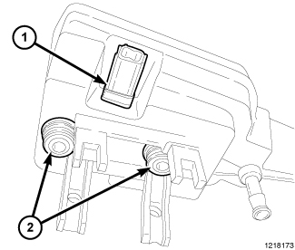 3. Lubricate the reservoir mounting area with fresh clean brake fluid. With the grommet seals (2) on the fluid reservoir spigots, place the reservoir in position over the master cylinder. Install the fluid reservoir by firmly pressing down on the fluid reservoir. Once installed, make sure the fluid reservoir is touching the top of both grommet seals.