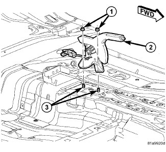1. Place the parking brake lever (2) on the mounting studs (3) affixed to the vehicle floor pan. Install and tighten the nuts (1) to 25 Nm (221 in. lbs.).