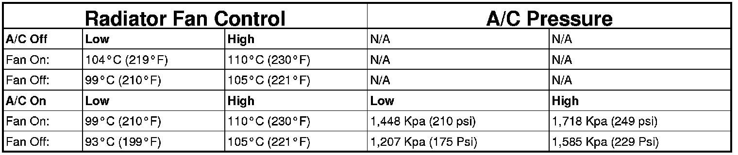Fan control is accomplished three ways. The fan runs when the air conditioning pressure reaches a set pressure, refer to RADIATOR FAN OPERATION chart. In addition to this control, the fan is turned on by the temperature of the coolant which is sensed by the coolant temperature sensor which sends the message to the Powertrain Control Module (PCM). The PCM turns on the fan through a fan relay. On models equipped with automatic transmission, a transmission fluid thermister may have some influences on fan operation.