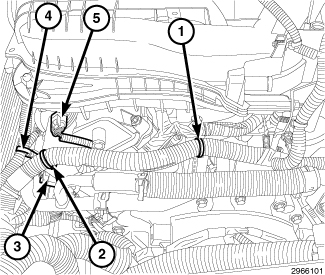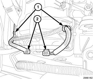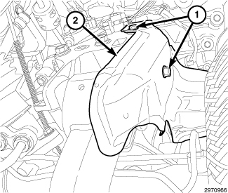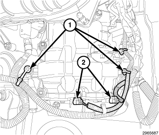 65. Engage two upper wire harness retainers (2) to the intake manifold support brackets.