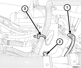 54. Engage the wire harness retainer (3) to the intake manifold support bracket.