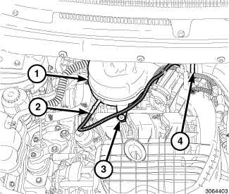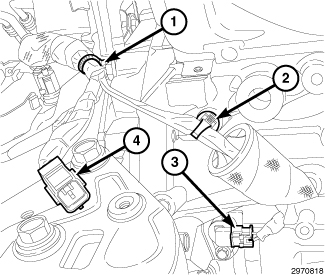 61. Engage one main wire harness retainer (2) to the cylinder head cover and one main wire harness retainer (4) to the cylinder head cover mounting stud.