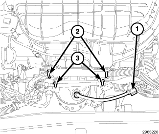 64. Engage two lower wire harness retainers (3) to the intake manifold support brackets.