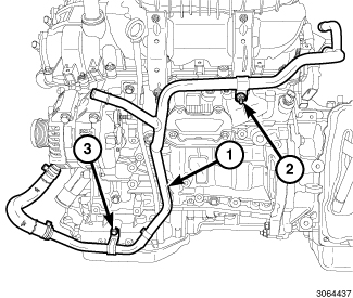 75. Install the heater core return tube (1) with the nut (2) and bolt (3).