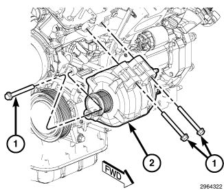 44. Install the front engine mount bracket (1). Tighten bolts (2) to 55 Nm (41 ft. lbs.).
