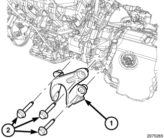 11. Install two bolts (1) to the LH engine (transmission) mount bracket (2).