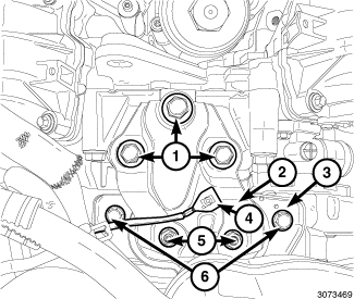 21. If required, install the four transaxle-to-engine lower bolts (2) and tighten to 70 Nm 52 ft. lbs.).