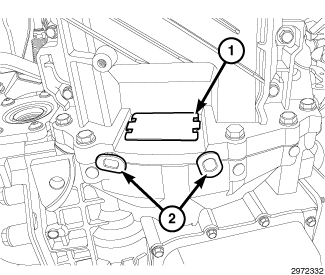 37. Engage one wire harness retainer (2) to the engine block and one wire harness retainer (1) to the transmission mounting stud.