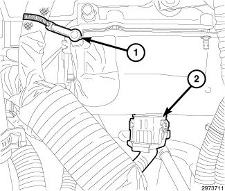 53. Engage the wire harness retainer (2) to the upper intake manifold support bracket mounting stud.