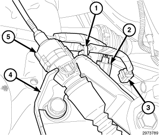 36. Engage the downstream oxygen sensor connector (4) to the engine mount.
