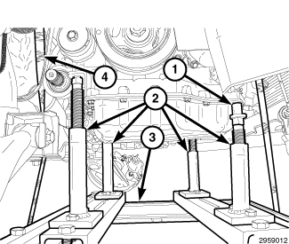 4. Position a load-leveling lifting sling (2), such as OTC(R) 4305 Engine Load Leveler or equivalent, between the engine lifting brackets (3) and an engine hoist (1).