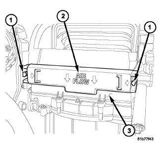2. Disengage the two retaining tabs (1) that secure the particulate air filter cover (2) to the passenger side of the HVAC housing (3) and remove the cover.