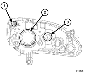 3. Disconnect the Front End Module (FEM) wire harness connector from the headlamp high beam (1) or low beam (2) bulb connector receptacle (3).