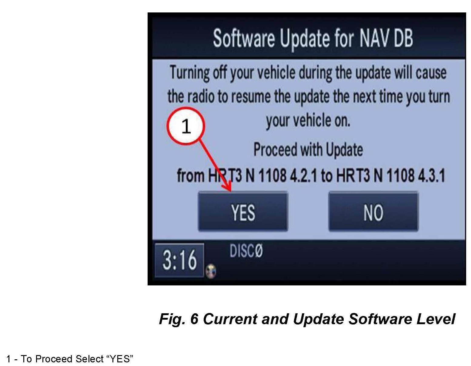 12. The next screen will display the current and new version of the Navigation Map database software (Fig. 6).