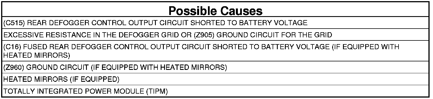 A shorted high condition in the (C515) Rear Defogger Control Output circuit or (C16) Fused Rear Defogger Control Output circuit.