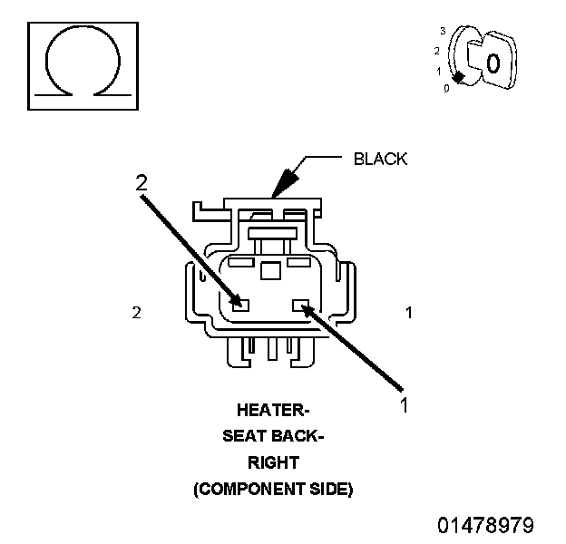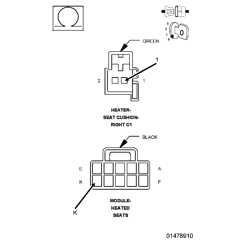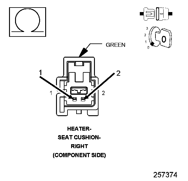 1. Using a 12-volt test light connected to 12-volts, check the (Z908) Ground circuit at the Right Seat Cushion Heater harness connector (harness side).
