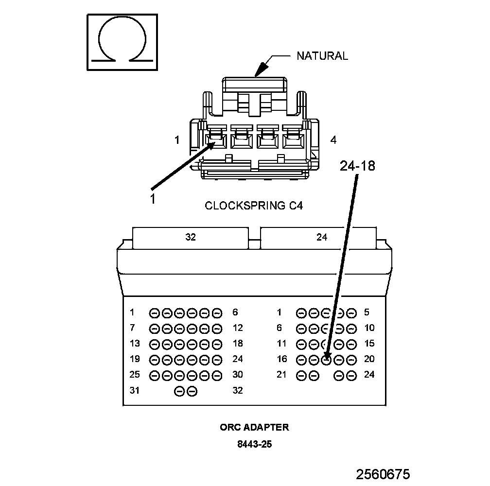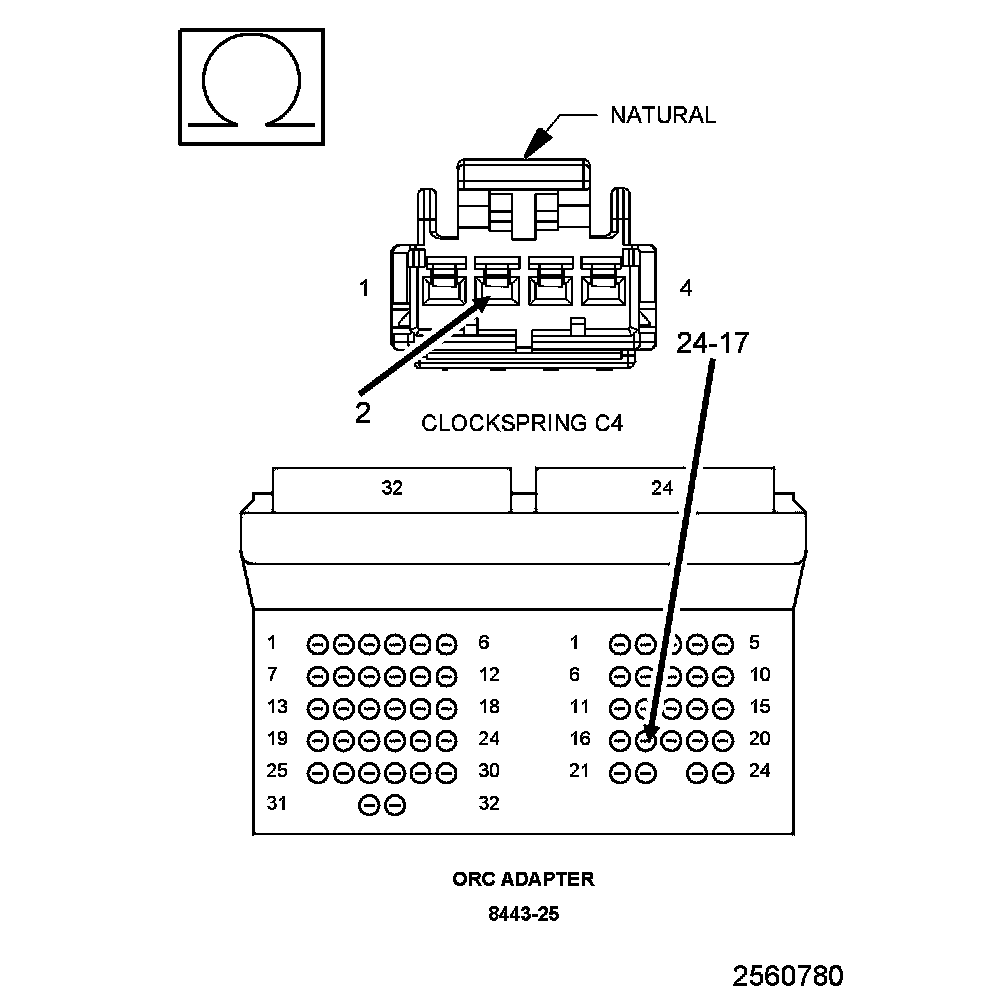 1. Measure the resistance of the (R61) Driver Squib 2 Line 2 circuit between the Clockspring C4 connector cavity 2 and the SRS Load Tool Adaptor cavity 24-17.