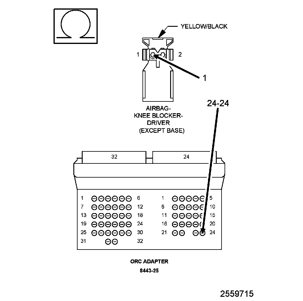 1. Measure the resistance of the (R9) Driver Knee Blocker Squib Line 2 circuit between the Driver knee Bolster Airbag connector cavity 1 and the SRS Load Tool Adaptor cavity 24-24.