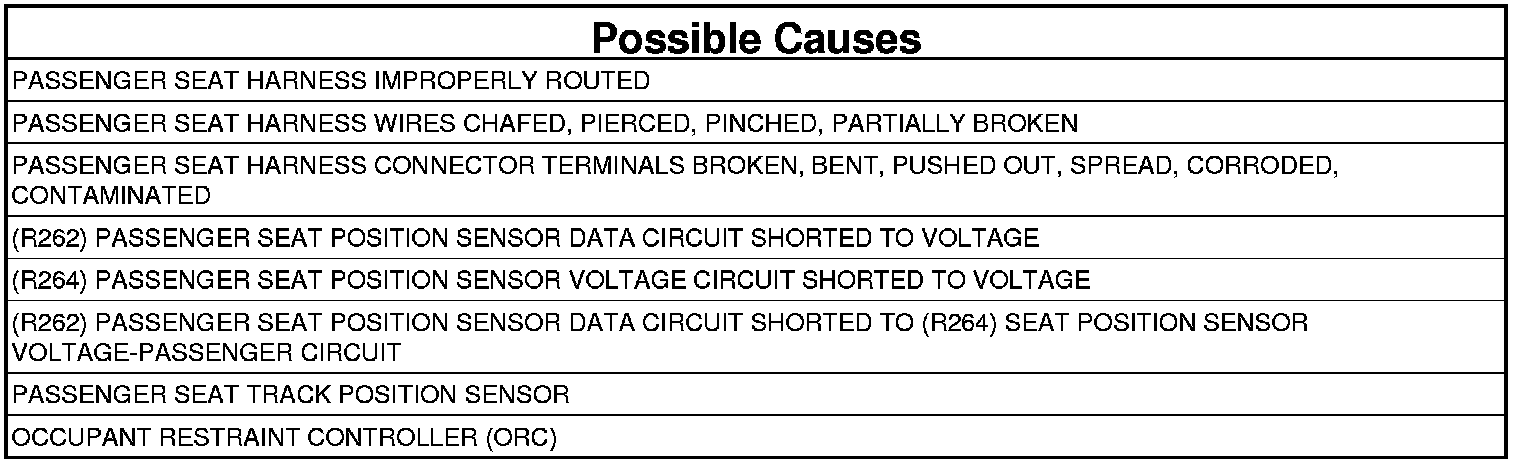 7. CHECK (R262) SEAT POSITION SENSOR DATA-PASSENGER CIRCUIT FOR A SHORT TO (R264) SEAT POSITION SENSOR VOLTAGE-PASSENGER CIRCUIT