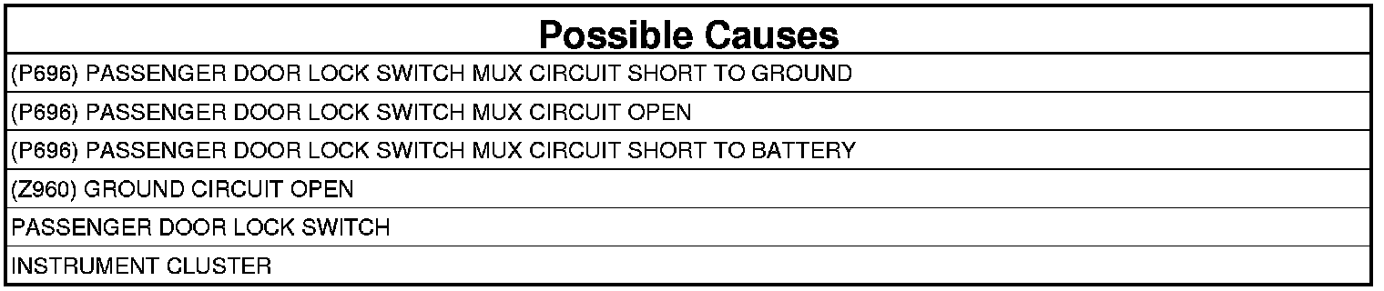 - Repair the (P696) Passenger Door Lock Switch Mux circuit for an open.