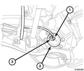 5. If equipped with a wheel speed sensor, Install the wheel speed sensor head (3) into the rear of the hub and bearing (2). Install the wheel speed sensor head mounting screw (1). Tighten the screw to 10 Nm (89 in. lbs.).