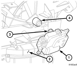 5. Install the recirculation door actuator onto the air inlet housing. If necessary, rotate the actuator slightly to align the splines on the actuator output shaft (3) with those on the recirculation door pivot shaft adapter (4).