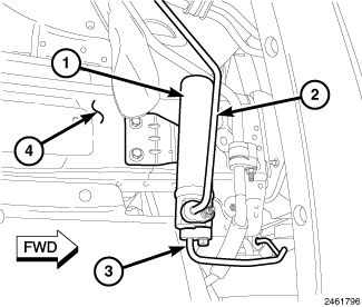 On all early model vehicles, the A/C receiver/drier (1) is mounted to the right front frame rail (4). On late model vehicles, only the gasoline and diesel engine models with manual or Constant Velocity Transaxle (CVT) have the A/C receiver/drier mounted to the frame rail. Late model gasoline engine equipped vehicles with automatic transaxle have the A/C receiver/drier mounted to the A/C condenser.