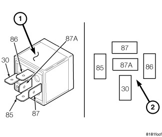Two relays (1) are used for the electric Positive Temperature Coefficient (PTC) heater system when equipped with the 2.2L diesel engine. The relays are International Standards Organization (ISO)-type relays. Relays conforming to the ISO specifications have common physical dimensions, current capacities, terminal functions and patterns (2). The PTC relays are electromechanical devices that switch fused battery current directly to the heating elements of the PTC heater unit. The PTC relays are energized by control circuits of the Totally Integrated Power Module (TIPM).