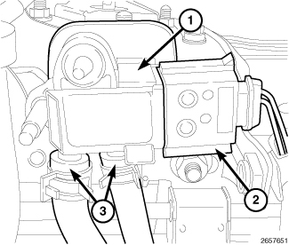 3. Disconnect the pressure differential sensor (1) vacuum lines (3).