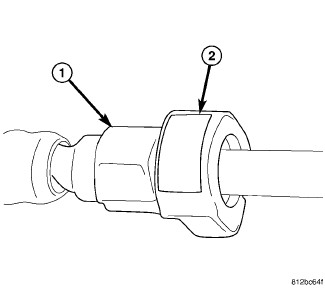 This type of quick-connect fitting (2) is equipped with tabs located on both sides of the fitting (1). These tabs are integral to the fuel system component. The plastic tabs will remain on the component being serviced after the quick-connect fitting is removed. The O-ring and spacer will remain in the quick-connect fitting. Special tools are not required for removal.
