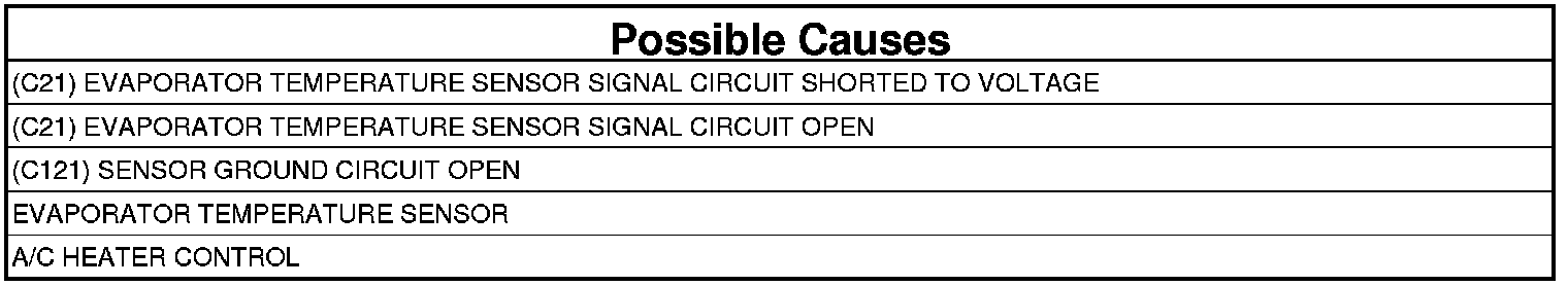 - Repair the (C21) Evaporator Temperature Sensor Signal circuit for a short to voltage.