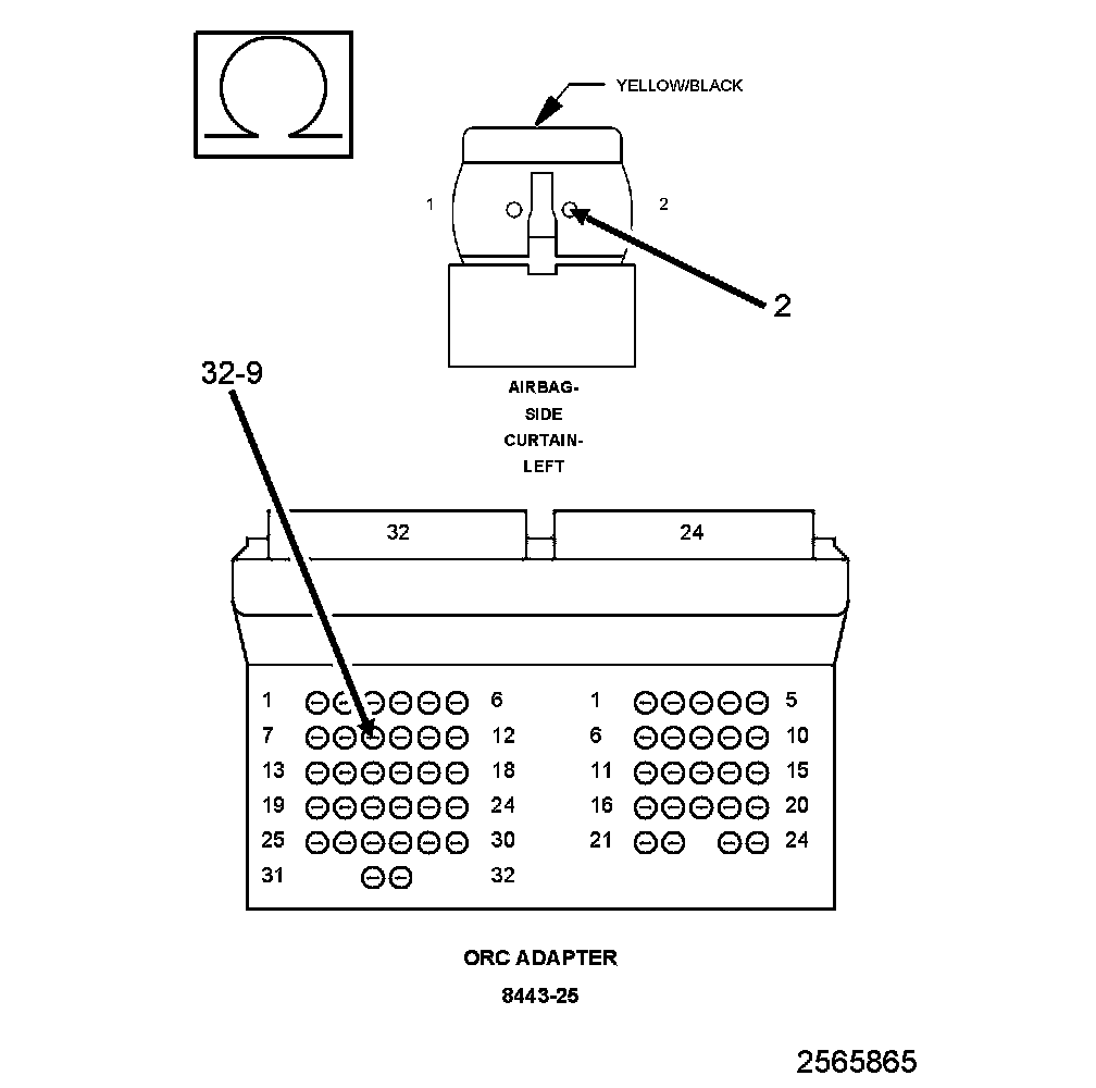 4. Measure the resistance of the (R3) Left Curtain Squib 1 Line 1 circuit between the Left Side Curtain Airbag connector cavity 2 and the SRS Load Tool Adaptor cavity 32-9.