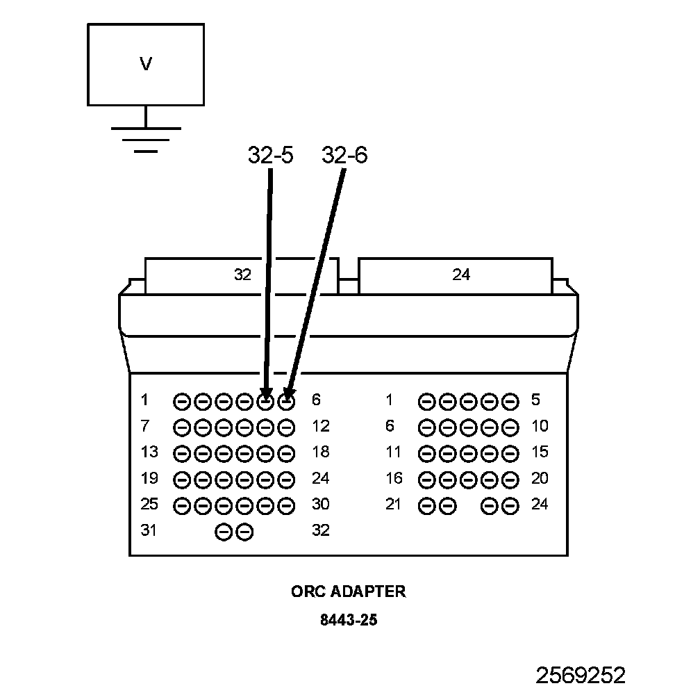 5. Measure the voltage of the (R8) Right Seat Squib 1 Line 1 circuit between the SRS Load Tool Adaptor cavity 32-5 and ground.