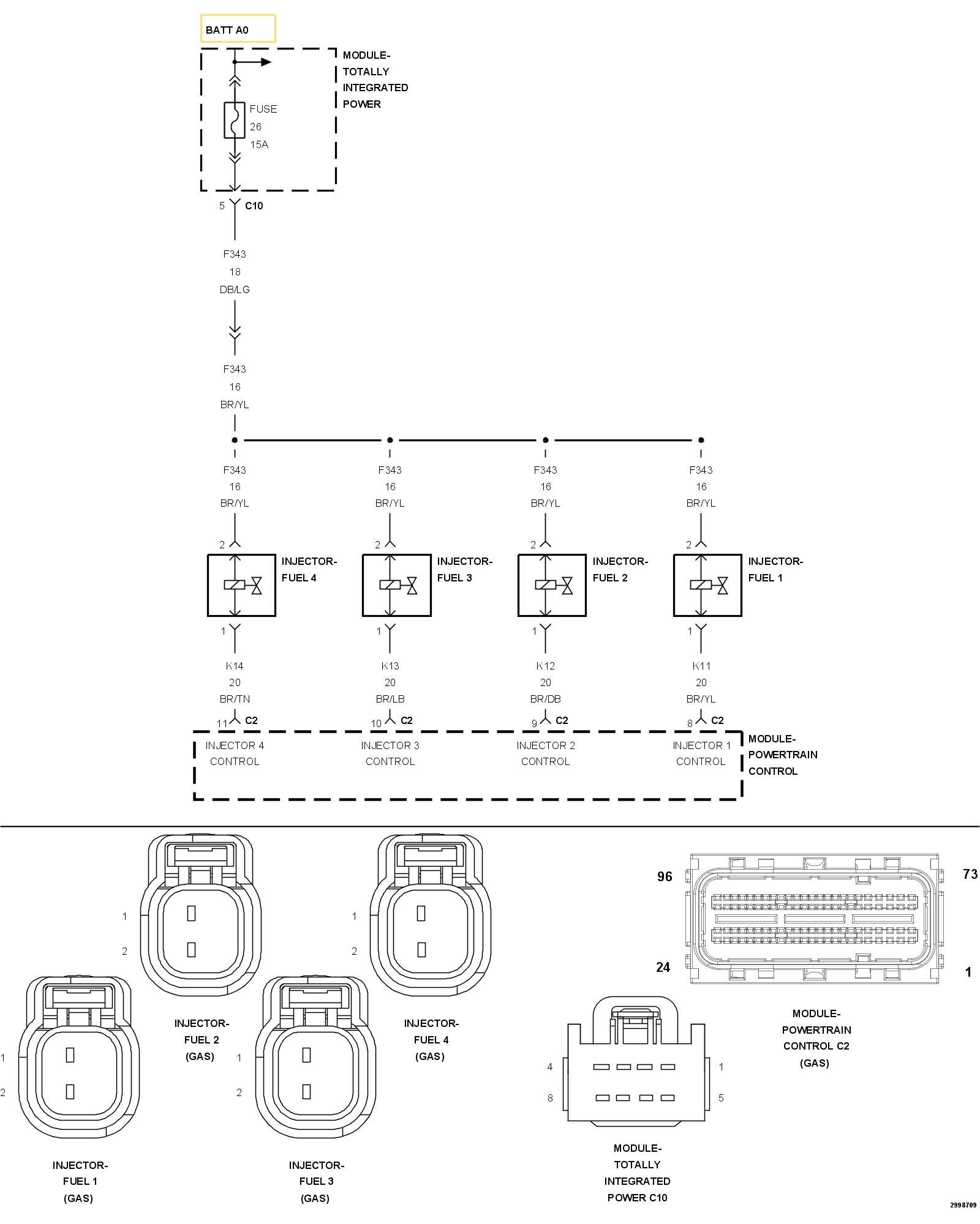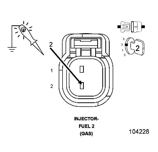 4. Using a 12-volt test light connected to ground, check the (K343) Fused ASD Relay Output circuit in the Fuel Injector 2 harness connector.