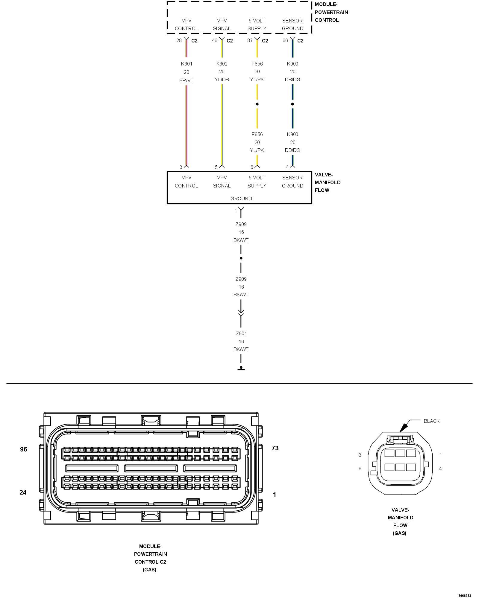 1. Measure the resistance of the (K900) Sensor Ground circuit between the Manifold Flow Valve harness connector and the PCM C2 harness connector.