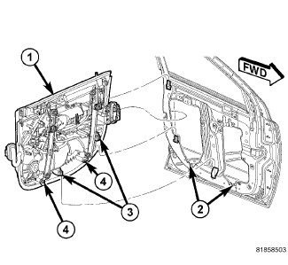 12. Lift the module (1) up off of the four trim hooks (3) and the lower regulator screws (4).