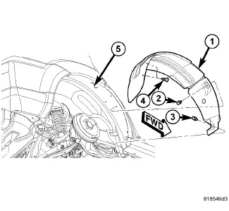 1. Place splash shield (1) up to wheel house (5) and align splash shield holes with fender.