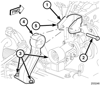 5. Remove the three bolts (3) attaching the rear roll mount (5) to the crossmember and remove the mount.